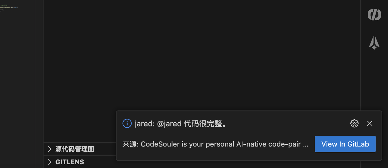 When receiving reviews and comments in a merge request using GitLab, the user who was mentioned or the initiator of the merge request will receive a notification in the bottom right corner of the VS Code interface. Clicking "View in GitLab" will take them to the corresponding comment location.