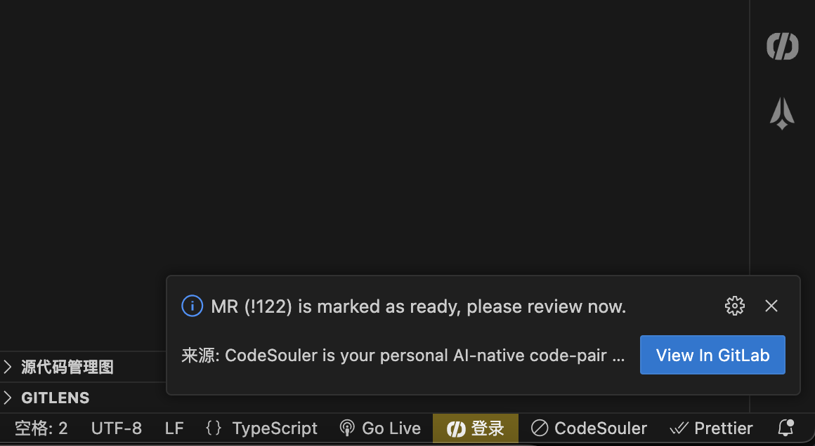 After creating a merge request using CodeSouler or GitLab, reviewers will receive a review request notification in the bottom right corner of the VS Code interface. Clicking "View in GitLab" will redirect them to the GitLab merge request page.