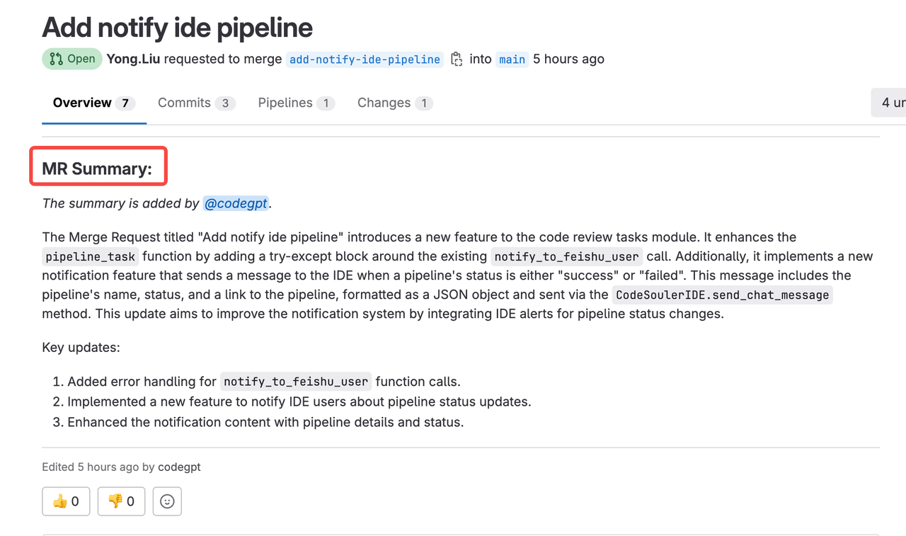 CodeSouler supports automatically generating content summaries in merge requests, including an overview of the merge request, changes made, and the scope of impact.