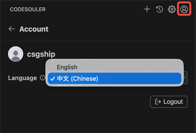 - CodeSouler supports switching the language of text/comments. Click the "Account" button and switch in the Account page.